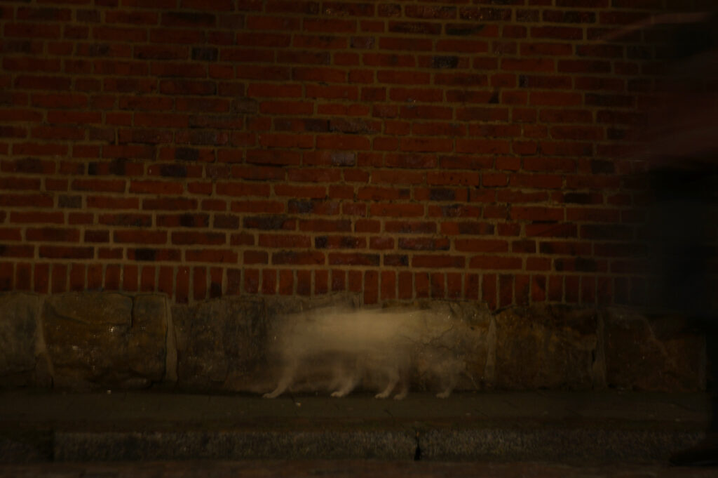 Första exponering visade hur rörelse och transparangs hänger ihop. Hunden rörde sig snabbt och kroppen blev jämn spökaktig halvgenomskinlig men tassarna som var fast på marken en liten längre stund då och då men rörde sig snabbt i mellan gav ett annat avtryck. Ingen bra foto men roligt att vovven fick extra många ben.