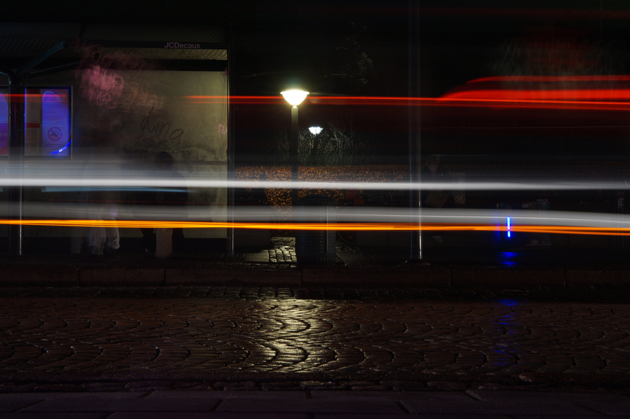 Det var barnsligt kul att måla med ljuskällor som rör sig i mörket. Det är bara att sätta sig och vänta till en cykel eller bus kör förbi och man lyckas få med den i en exponering. På min utvalda bild (ovan) sitter också folk och väntar på rätt buss fast de vill nog stiga på. Jag vill att bussen ska passera förbi och bara lämna ett tecken på att den har varit där. Ett spår på scenen som ger stillbilden ett tidsaspekt. Exponeringstiden avgör hur rörelsen fångas.