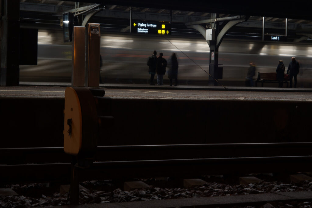 …eller tvärtom, folk som väntar och tåg som susar förbi.