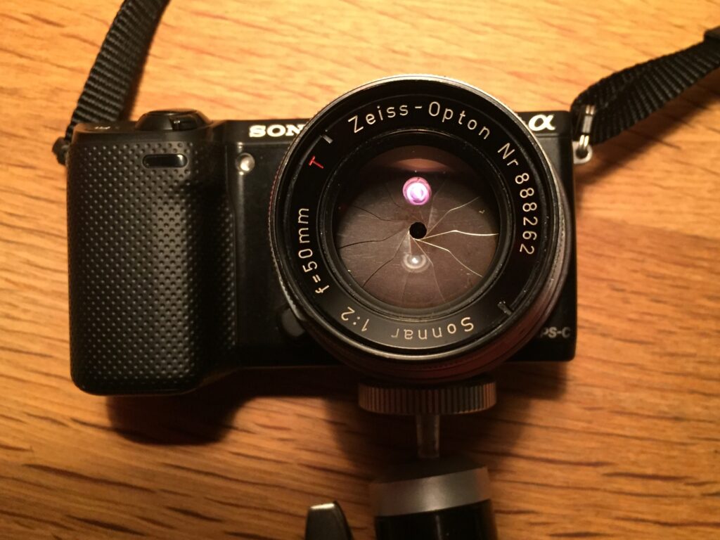 Alltid bra att kolla nya linsers färgbollar i mörket med fullt öppen iris. Dagens lins blev en Zeiss Sonnar 50 mm f 2.0 från min pappas första seriösa kamera, Contax II, som sen blev min första när han bytte till Nikon F2.