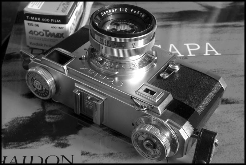 Även Robert Capa använde denna Contax II model på D-dagen under landgången på Normandiet med samma lins. Monterat på min Sony Nex5R (bilden till vänster), dvs via dubbelt lins-adapter Contax->Nikon->SonyE, får jag klara mig utan avstånds indikeringen som sitter kvar på kamerahuset :P